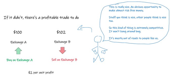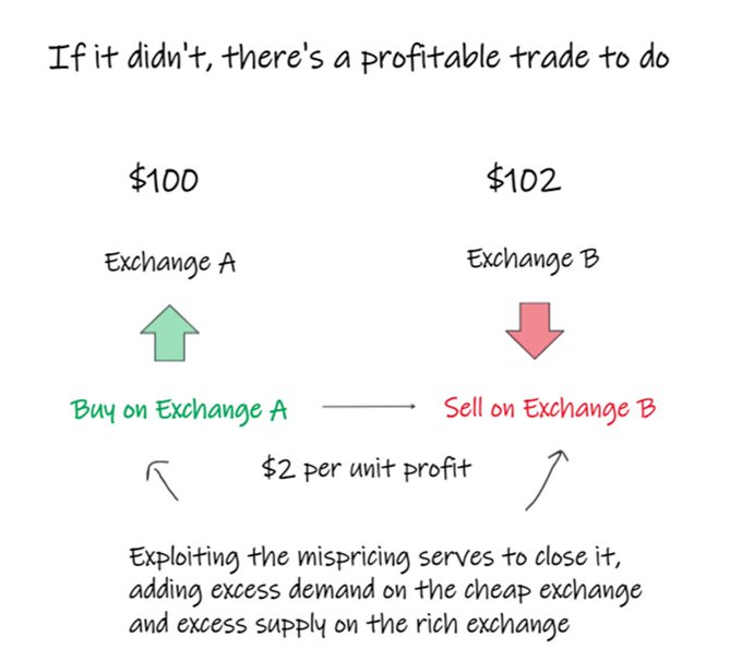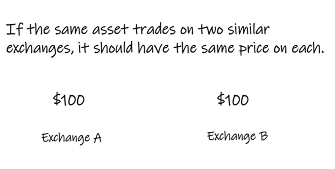 trivial example: if shares in the same asset trade on two different exchanges, they should have the same price on each of them.