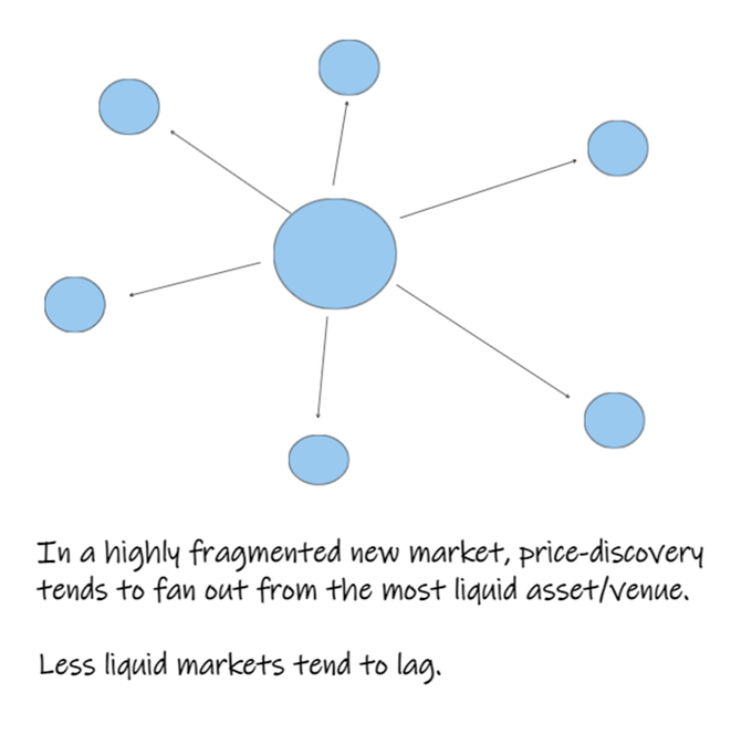it tends to happen in the most liquid asset/venue and then fan out, on a lag.