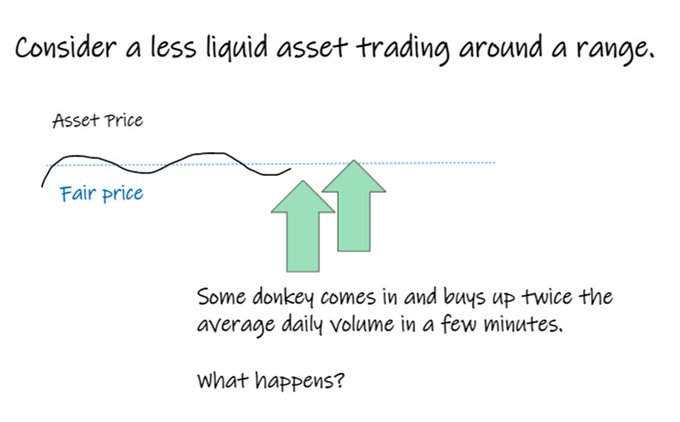 imagine a less liquid asset is happily trading around a range, and some big donkey comes along and buys twice the average daily volume in a few minutes.