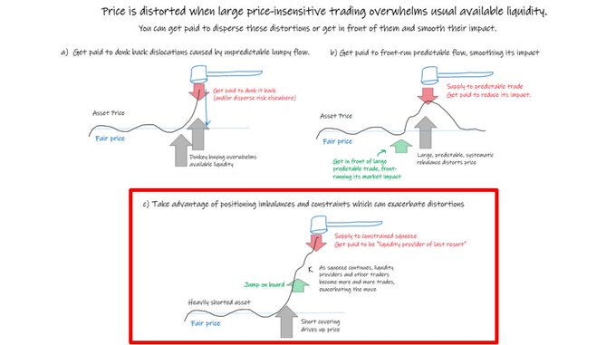 rebalances, predictable de-leveraging, liquidations, tax harvesting, employee share vesting, dividend reinvestment programs can all be the cause of large predictable price-insensitive that can distort price.