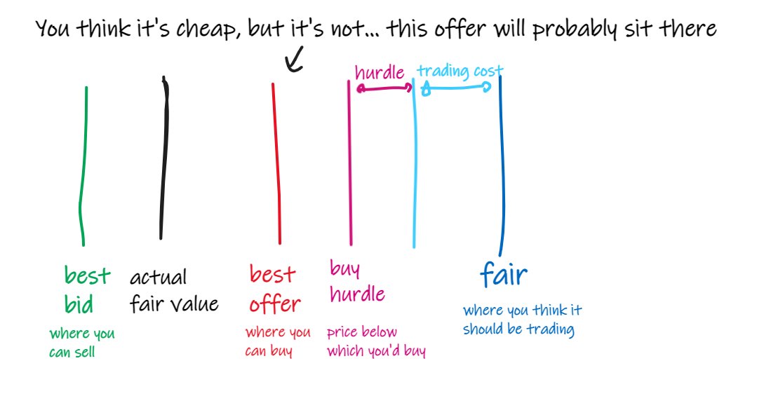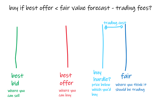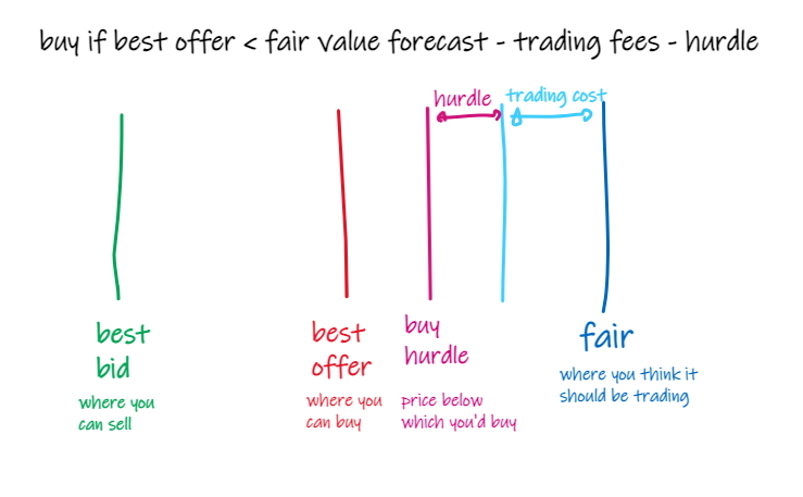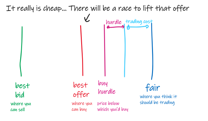 now you need someone offering to sell at less than your fair value, less your costs to trade, less a hurdle.