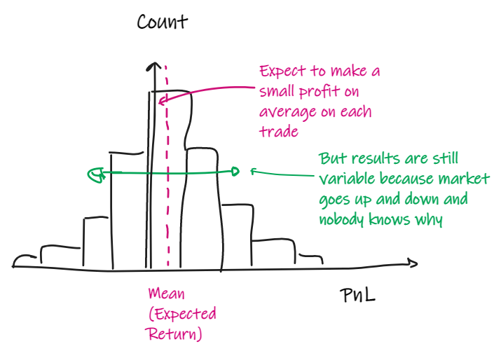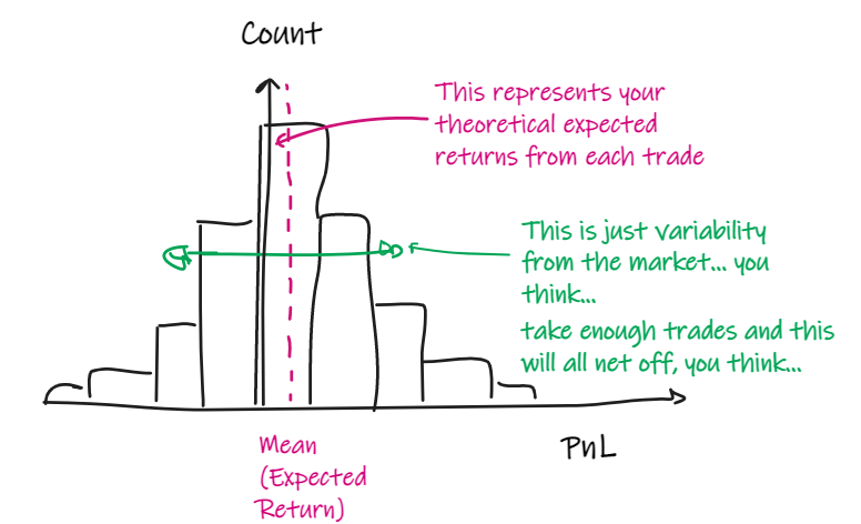 when you plotted that histogram and thought that it represented your edge, you implicitly assumed that your edge was the same for every single trade.