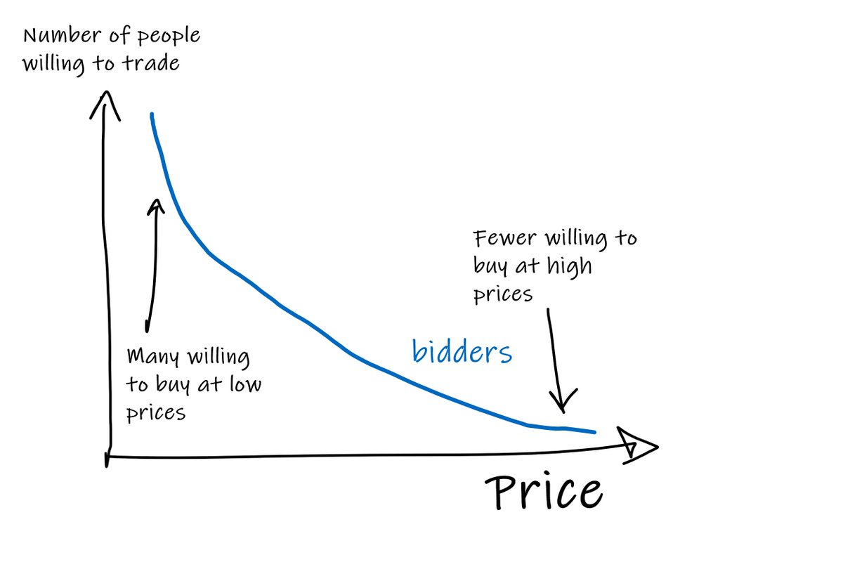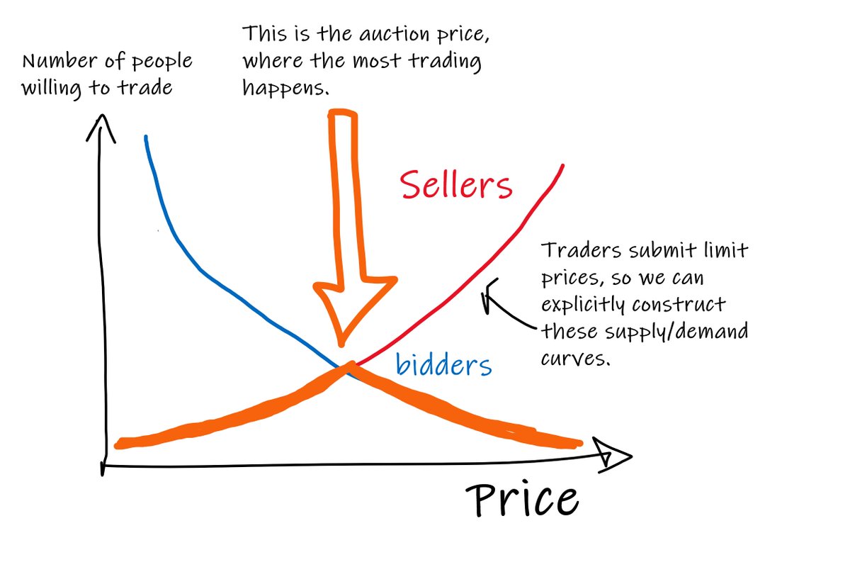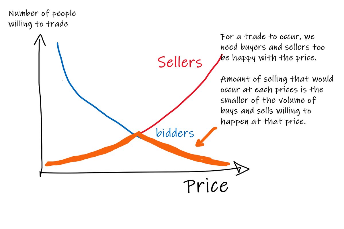 assume the purpose of a market or exchange is to find the balancing point of supply and demand where the most trading happens.