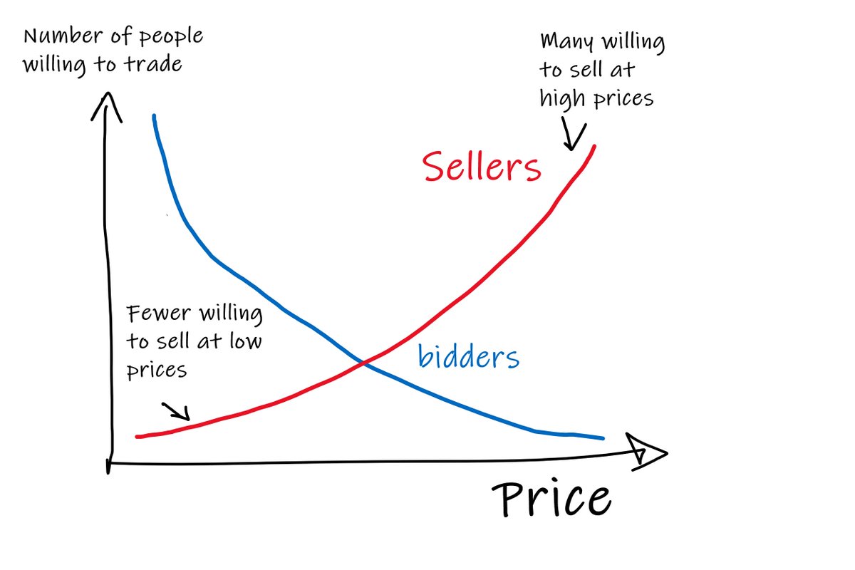 the process of "price discovery" is an attempt to find the price point depicted by the orange arrow below - in which the max amount of buying and selling occurs.