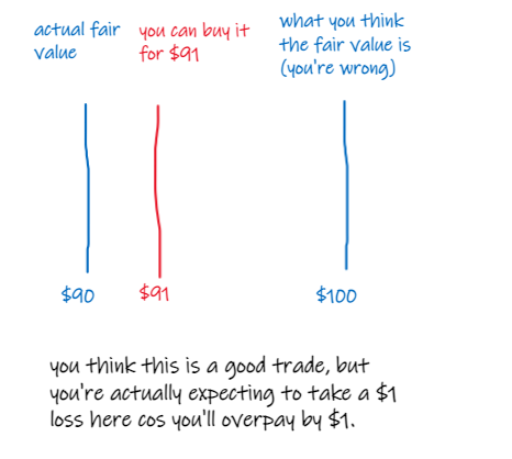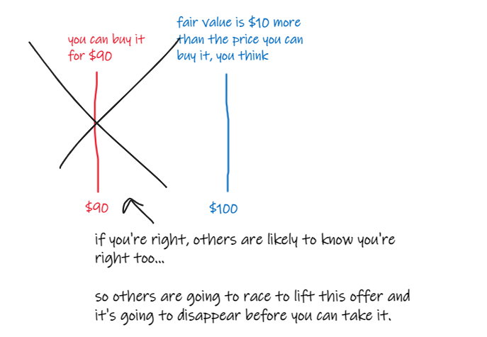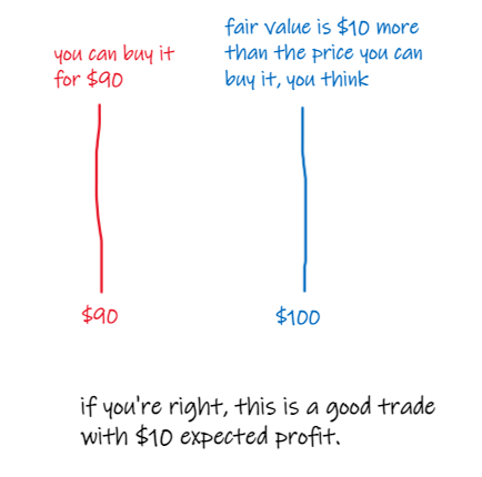 imagine an asset is offered at $90 but you think it's worth $100 - someone is willing to sell it at a $10 discount, you think.